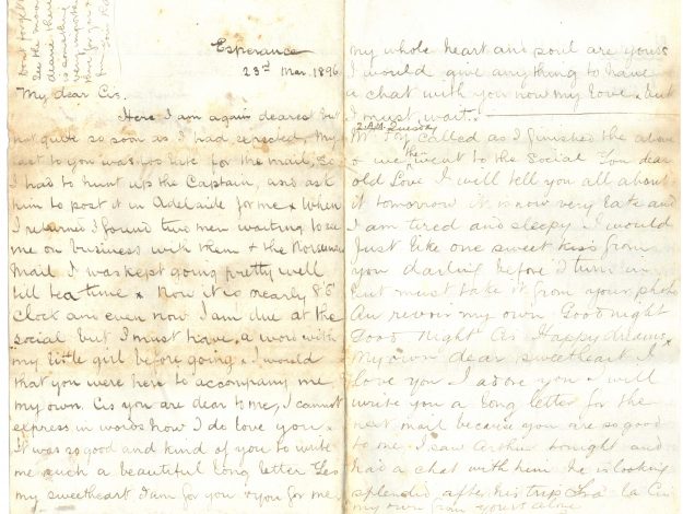 The documents in the Sharkey donation are a few hundred pages of letters written by Raymond and other family members going back to 1892. The earliest ones are letters from Raymond to his future wife Florence Edith (often referred to as Cis in his letters) regarding his daily life in Esperance which, over time, gain a romantic flair!
